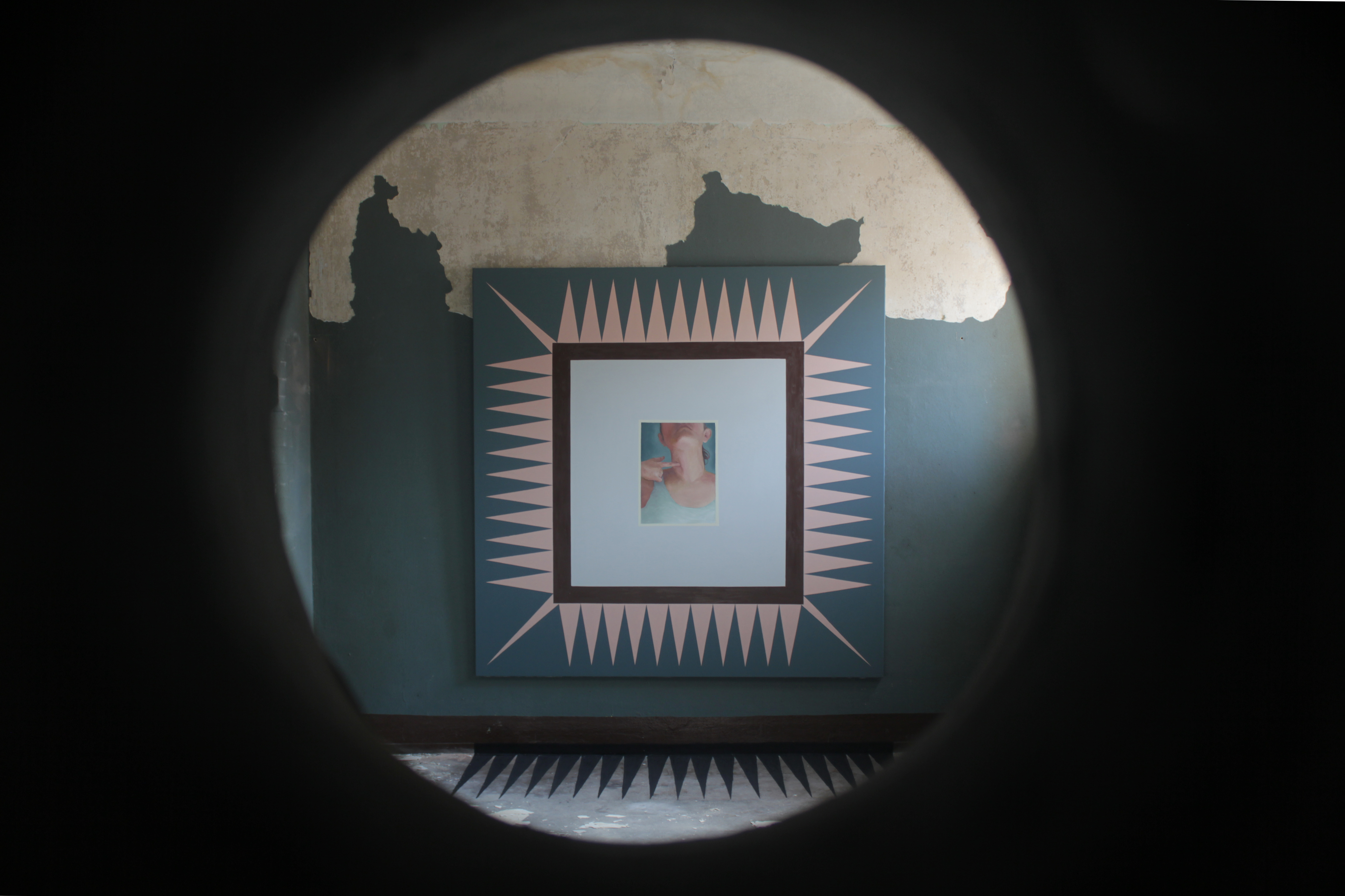 The artist Malin Holmberg spent most of her time leading up to the opening shut away in one of the larger rooms in the prison, which had a curious peephole in a wall that allowed for observation of the room from the hallway. We suspected this may have been an interrogation room, where an unseen observer could watch what happened on the inside, as through a one-way mirror. Holmberg made a site-specific painting that camouflaged itself in this room by adopting the teal colour of the wall paint and extending its vaguely threatening zigzags from the canvas onto the floor below. Once finished, the painting was locked in the room, and could only be viewed through the peephole.